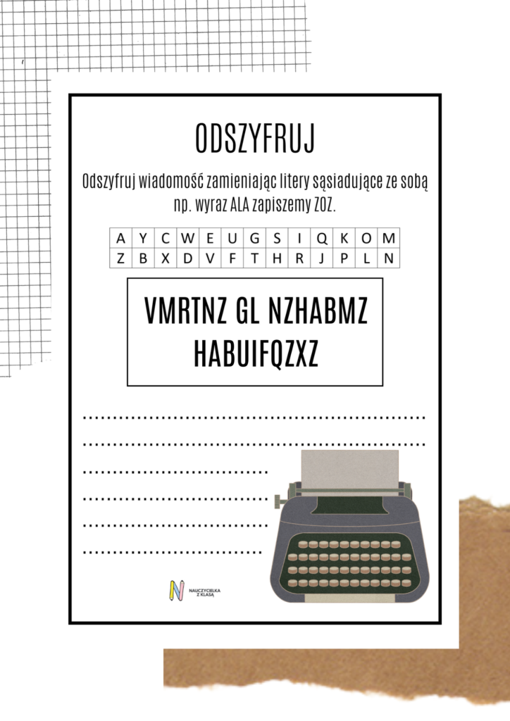 Przygotowałam plakat i kartę pracy, którą możesz wykorzystać podczas zajęć z uczniami. Zastosowałam w niej tzw. szyfr podstawieniowy. Zadaniem uczniów jest odszyfrowanie wiadomości poprzez podmienianie liter sąsiadujących ze sobą. Litera „A” w zaszyfrowanej wiadomości , jest w rzeczywistości literą „Z”, litera „Y”, to litera „B” itd.