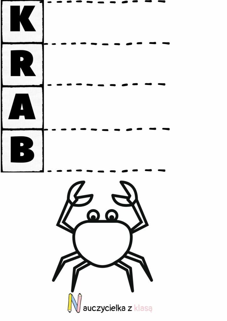 Uczniowie obok każdej litery tworzącej wyraz krab wypisują dowolne słowa rozpoczynające się na kolejne litery wyrazu, np. k- kolano, r-rower, a-aparat, b-brzeg.