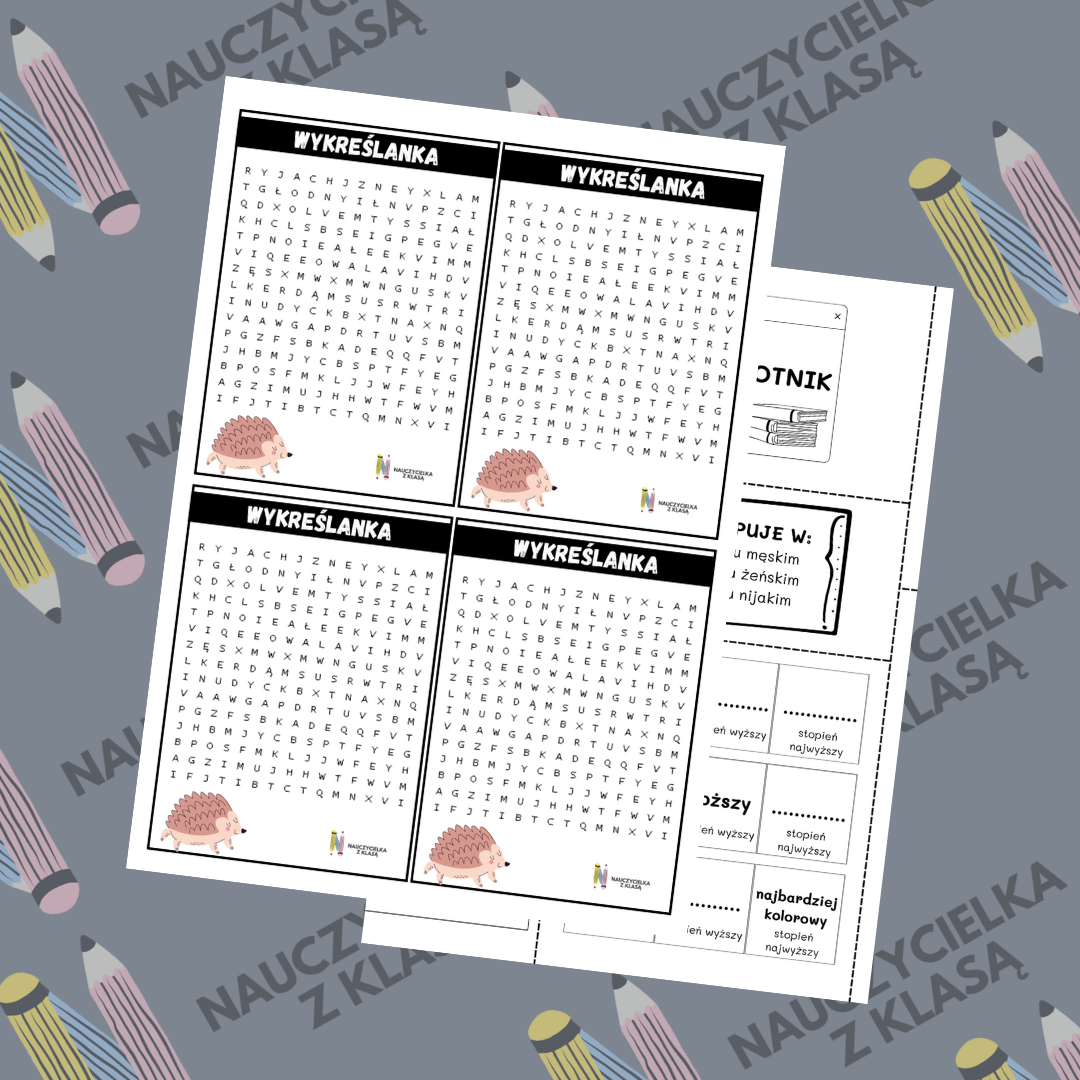 - 3 wersje kolorystyczne wklejek zawierające m.in.: definicję przymiotnika, pytania na jakie odpowiada przymiotnik, stopniowanie, grę planszową w dwóch rozmiarach, wykreślanki o różnych poziomach trudności.