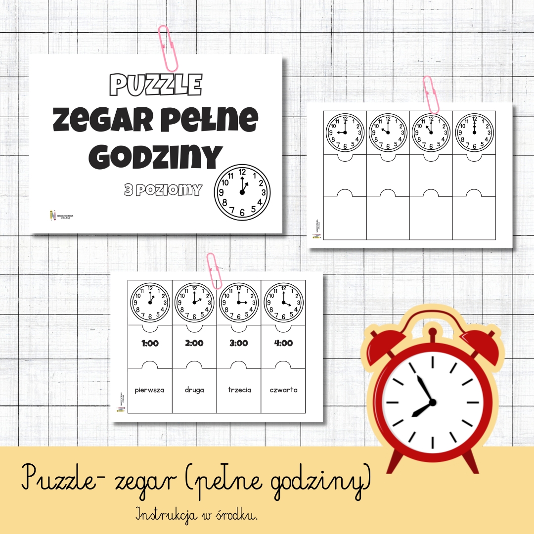 Zestaw Puzzle Matematyczne – Zegar Pełne Godziny to angażujący materiał edukacyjny w formacie PDF, stworzony z myślą o dzieciach uczących się odczytywania godzin na zegarze. Zawiera tylko pełne godziny, dzięki czemu idealnie sprawdzi się na początkowym etapie nauki pojęcia czasu.