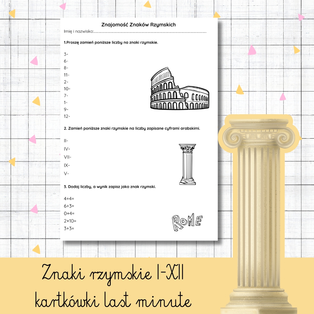 Gotowa do użycia kartkówka z wiedzy o znakach rzymskich, przygotowana specjalnie dla uczniów klas I–III szkoły podstawowej.